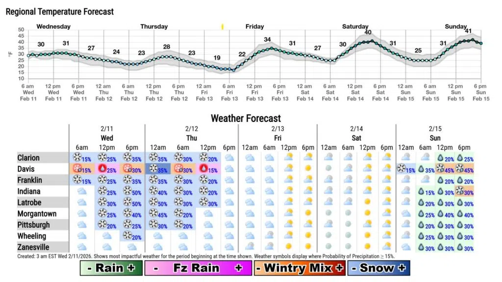 Colder temperatures are expected today and Thursday, with chances for light snow. Patchy freezing drizzle is also possible in the ridges this morning into the afternoon. Temperatures will warm to above freezing again for most areas on Friday, continuing into the weekend.